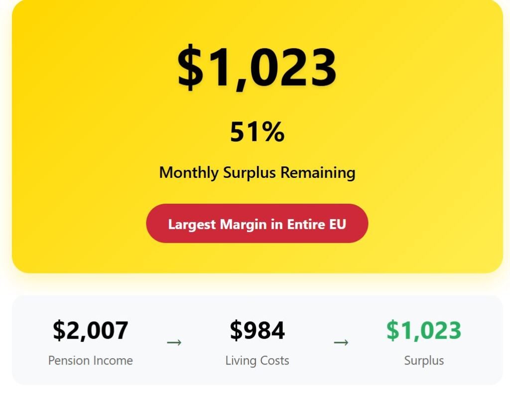Expats living on a $2,007 pension find immediate relief in accommodation costs. Rent for a one-bedroom apartment averages $405 per month, one of the lowest values across the European Union.