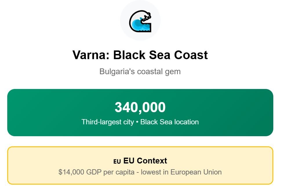 For Bulgaria, the chosen city is Varna. Positioned on the Black Sea coast, it has around 340,000 residents, making it the country’s third-largest city after Sofia and Plovdiv.