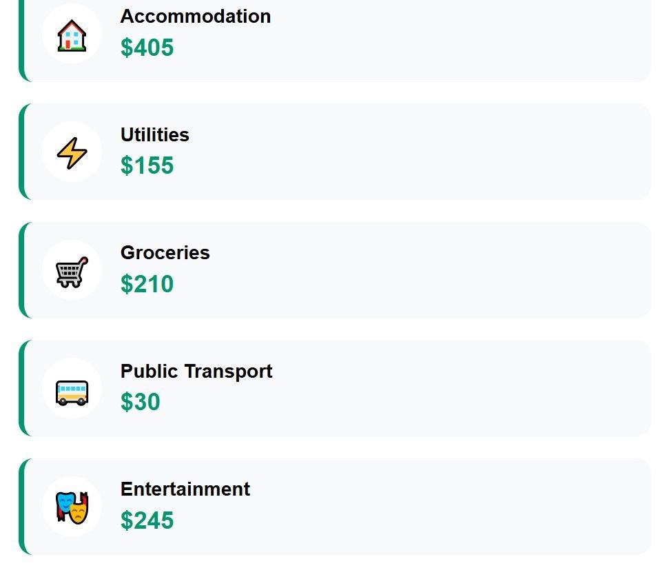 Then come groceries at $230, public transport for only $29, and leisure expenses at around $225. The combined monthly cost is $984.