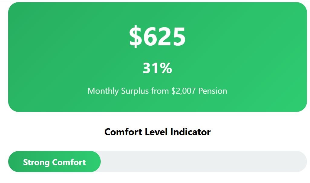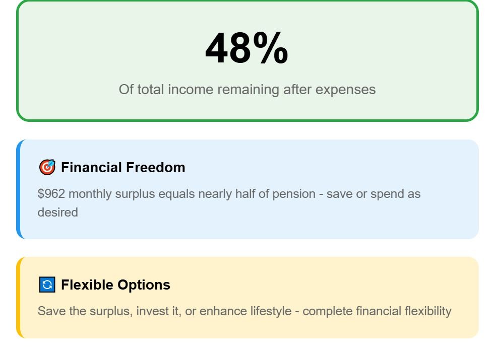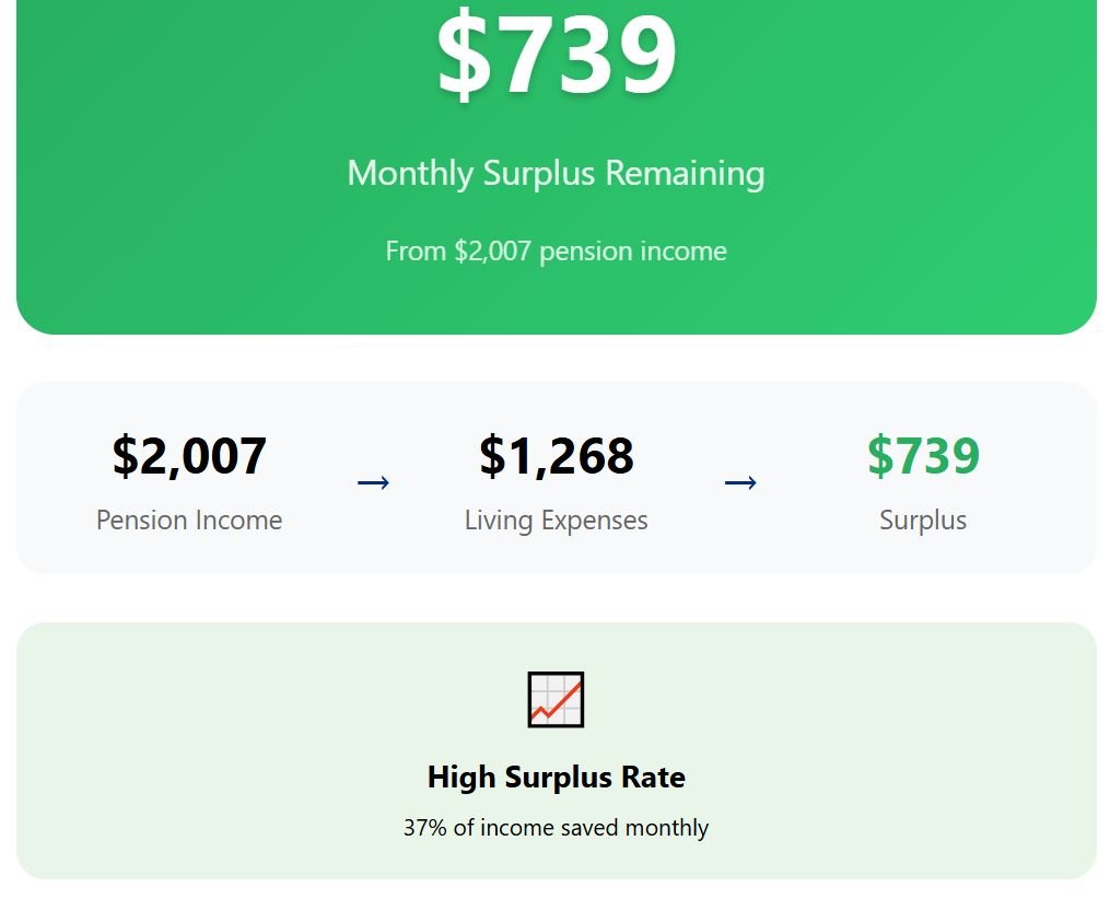 Adding all categories, the total is close to $1,352. That leaves a pensioner drawing $2,007 each month with $655 left over—a savings rate of about 33%.