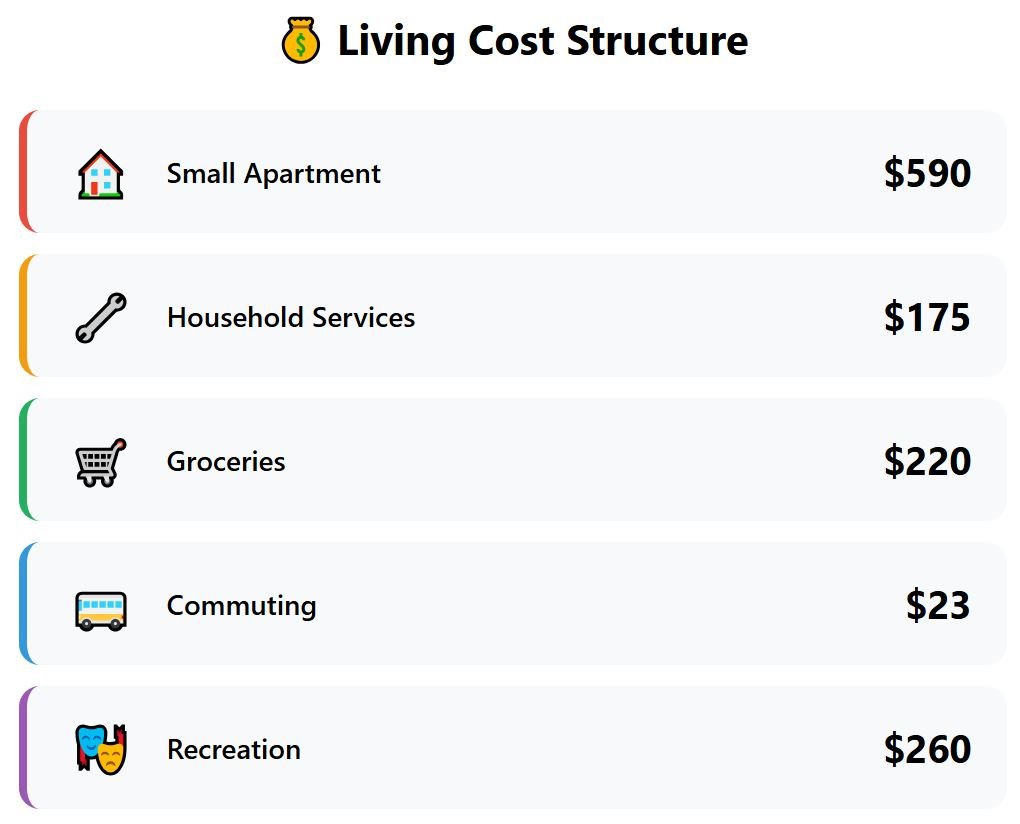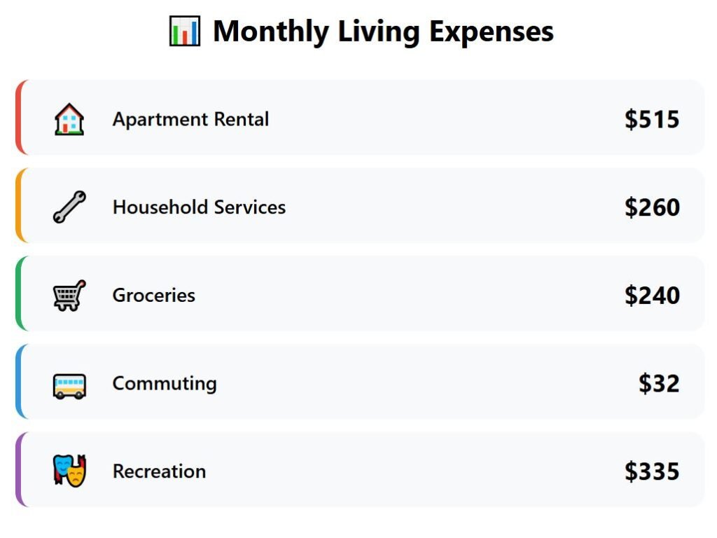 In Košice, rent still accounts for the largest expense—$670—but both groceries and leisure are affordable at $235 and $260 per month respectively. Transport costs $30, one of the lowest so far.