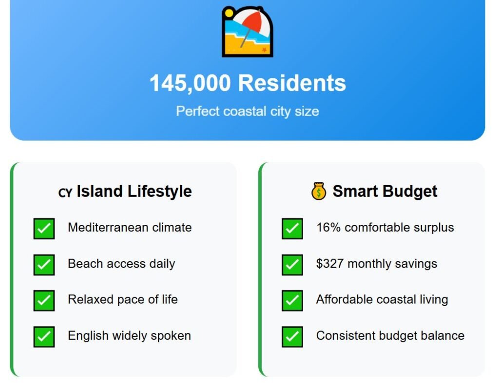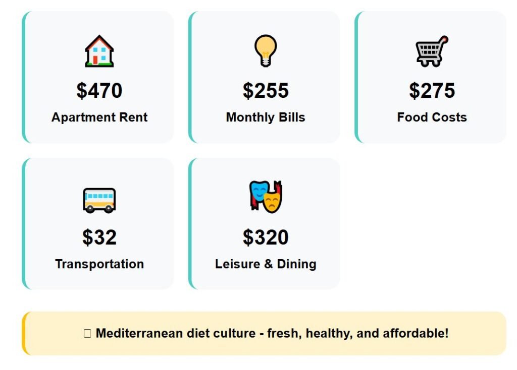 A one-bedroom apartment in Larnaca costs about $795 per month—a relatively low price when compared to other Mediterranean counterparts like Malta. Utilities reach $230, groceries average $285, local transit costs stay modest at $60, while entertainment is around $310.