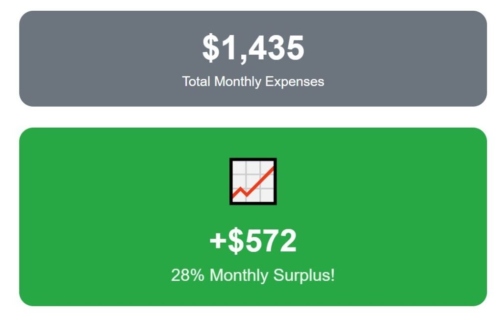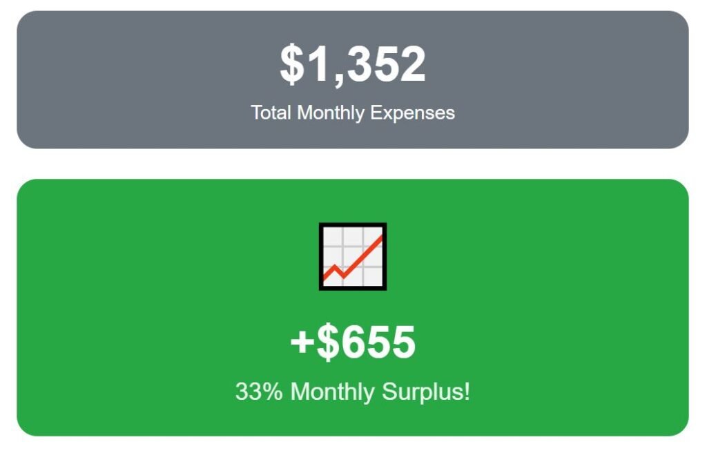 Altogether, that puts total expenses at $1,755 per month, and from our budget, 12% ($252) remains each month. It shows how a city like Valencia provides not just lifestyle appeal, but also a realistic financial cushion.