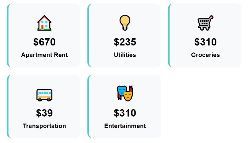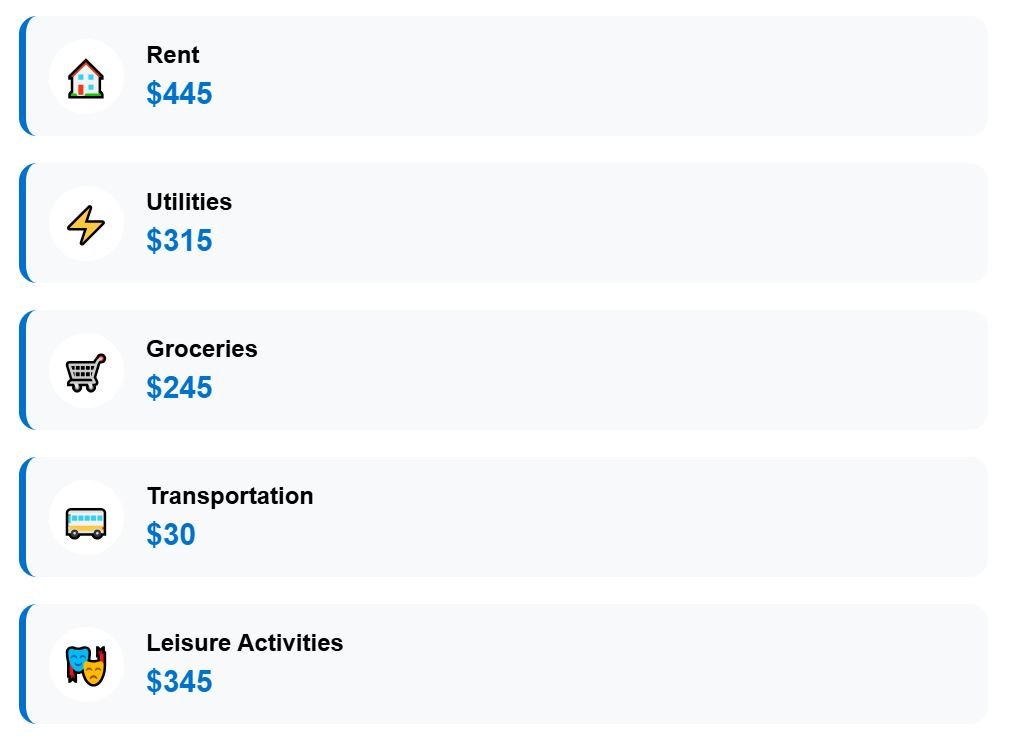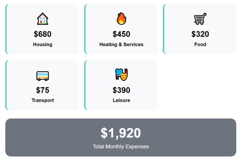 Monthly bills count for $255, which stays manageable even during winter. Food costs amount to $275 per month, transportation costs $32, and leisure activities cost $320.