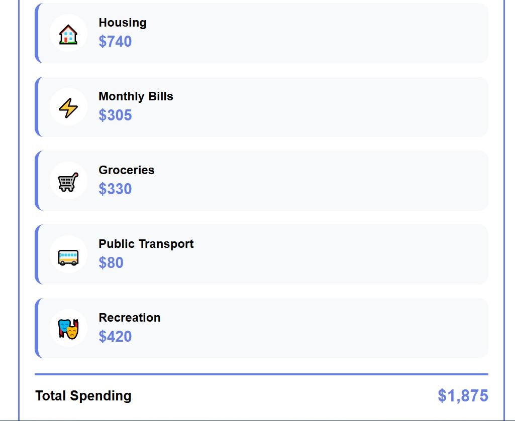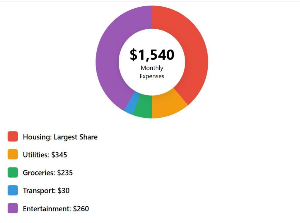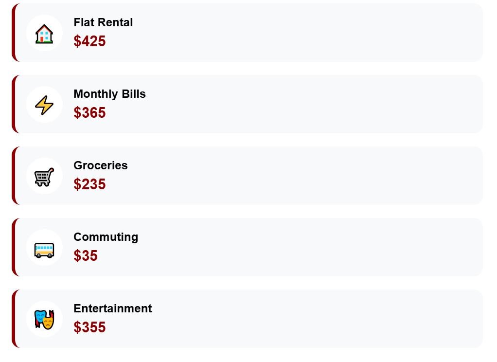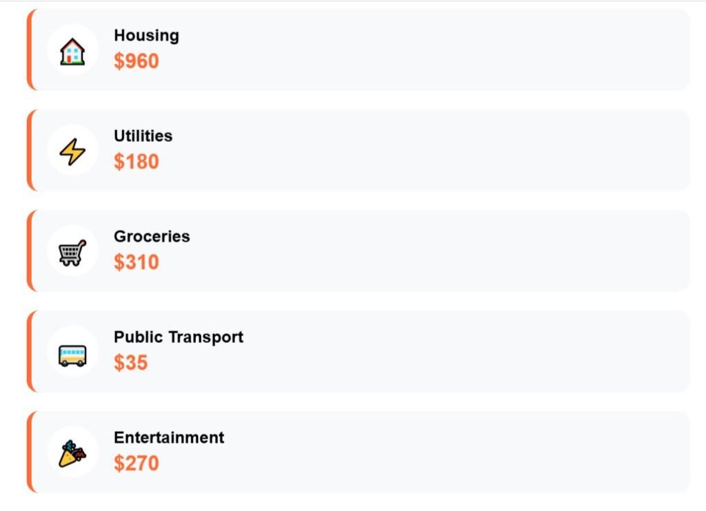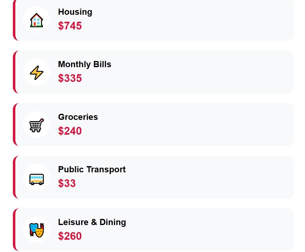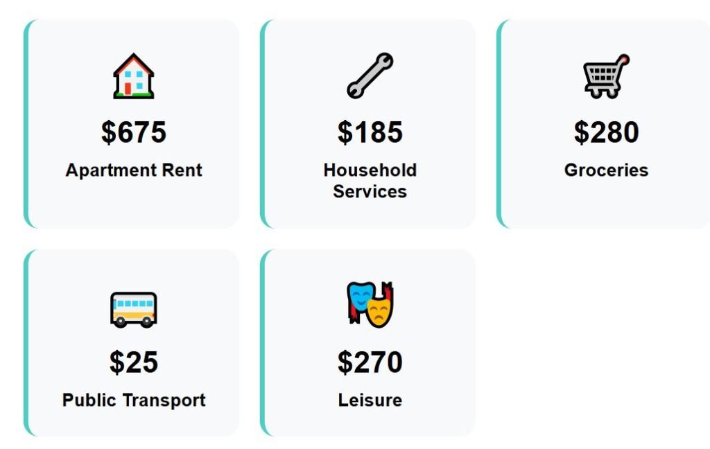 While rent carves away most of it, food and monthly bills add further strain. Leisure, which includes dining out or cultural activities, quickly raises the total to $2,660 per month.