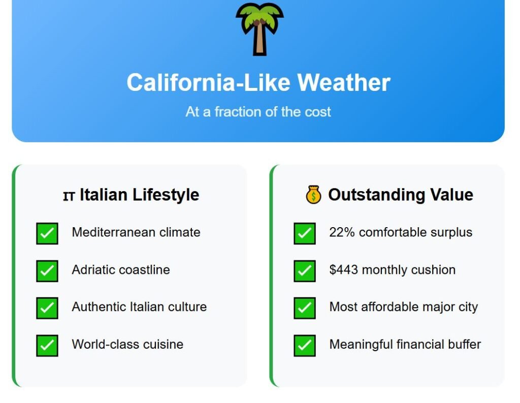 Adding these totals together, average expenses reach $1,564 each month, leaving $443 untouched from our $2,007 budget. Not only does Bari provide a surplus, but it also offers one of the best climates in Europe—a Mediterranean weather similar to California, but at a fraction of the cost.