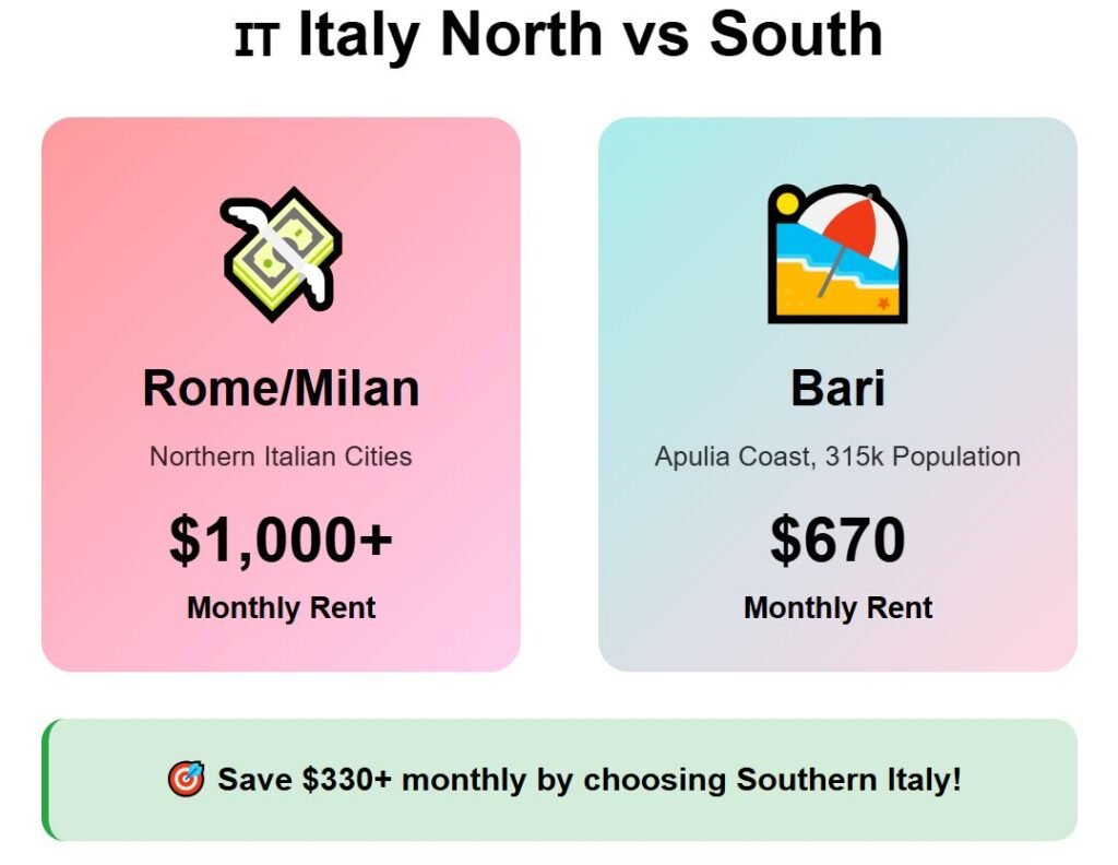 For Italy, the focus is on Bari, a city in the southern region of Apulia along the Adriatic coast, with 315,000 residents. Compared to Rome or Milan, where a one-bedroom apartment regularly exceeds $1,000, Bari is far more affordable—rent there averages just $670.