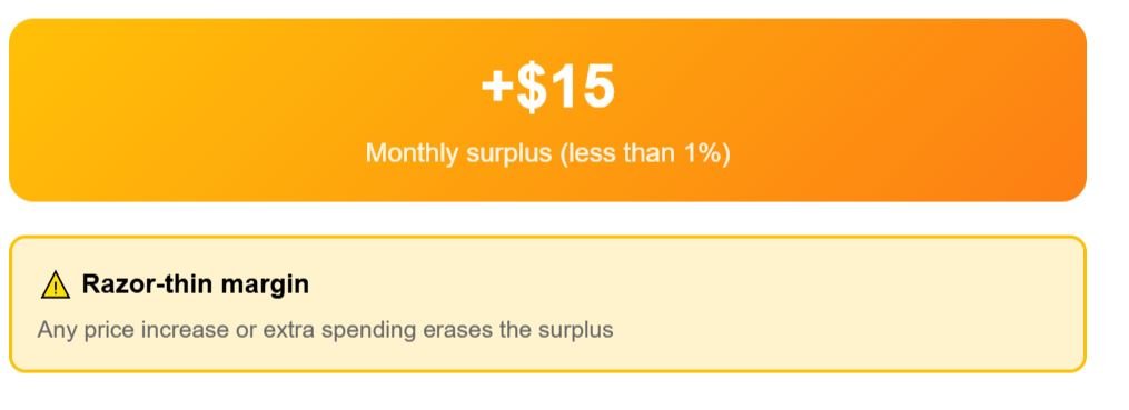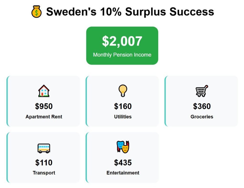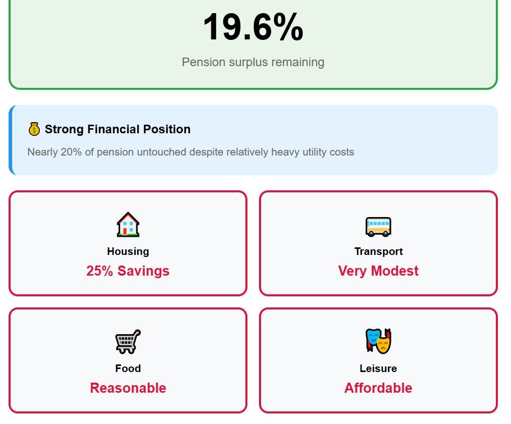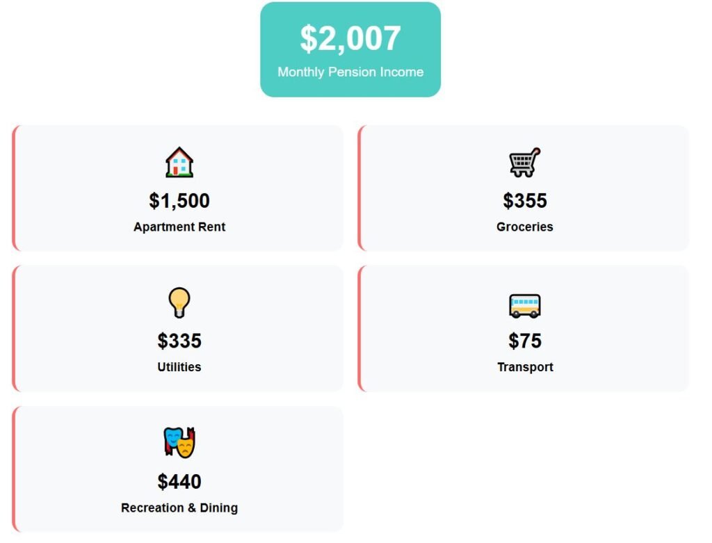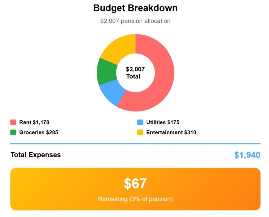 Monthly utilities remain manageable at around $175, groceries add around $285, while entertainment pushes the total budget to $1,940. That leaves just $67 remaining from the pension, equal to a slim 3%.