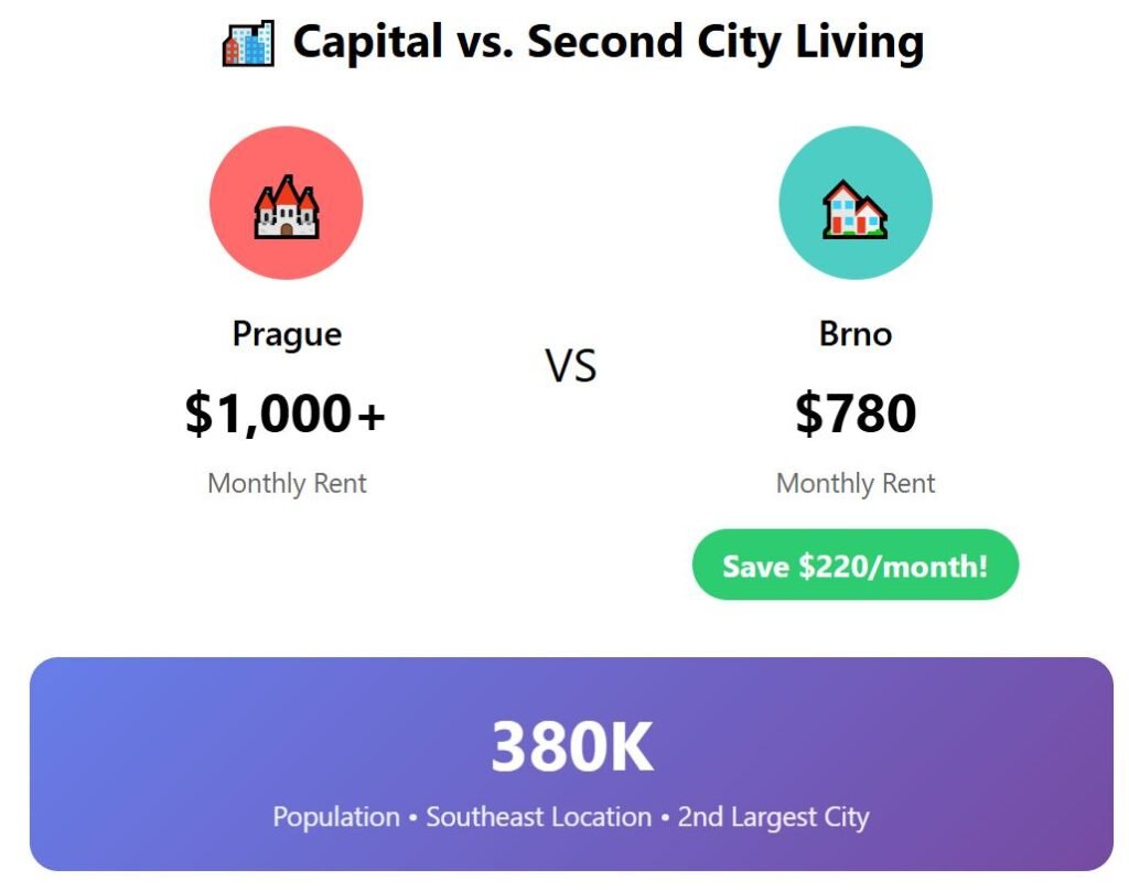 The advantage here is clear: Brno is much cheaper than the capital. Rent for a flat in Prague usually exceeds $1,000, while in Brno the average is about $780 per month.