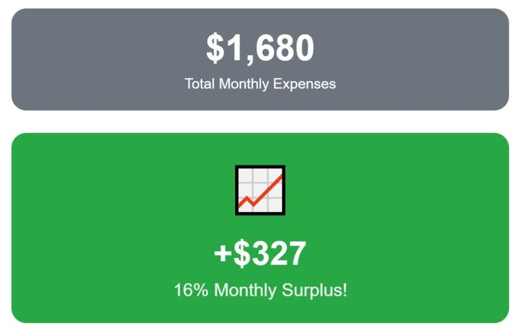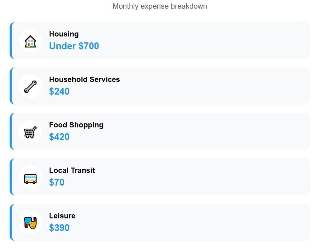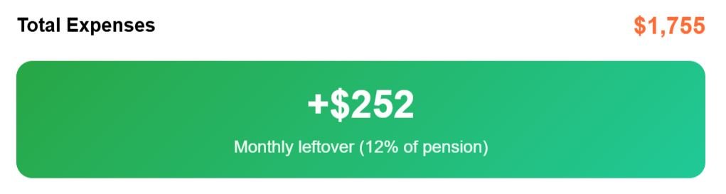 Altogether, total expenses are $1,875 per month, leaving retirees with $132—so 7% of our budget is untouched. Not large, but it still provides some breathing space for someone prioritizing the quality of surroundings and steady comfort.