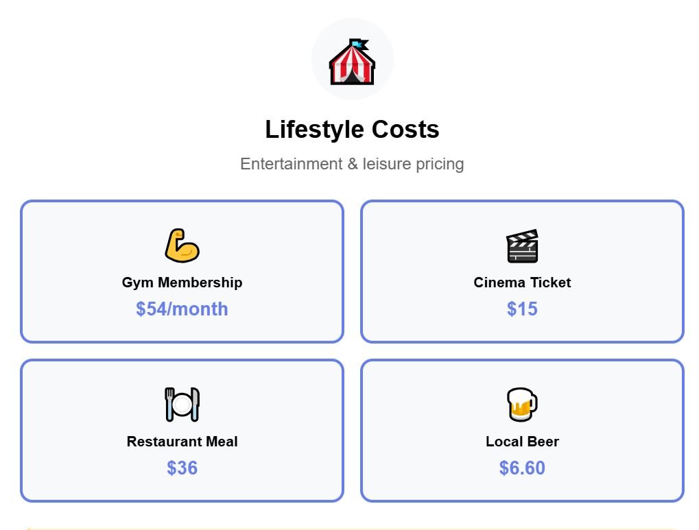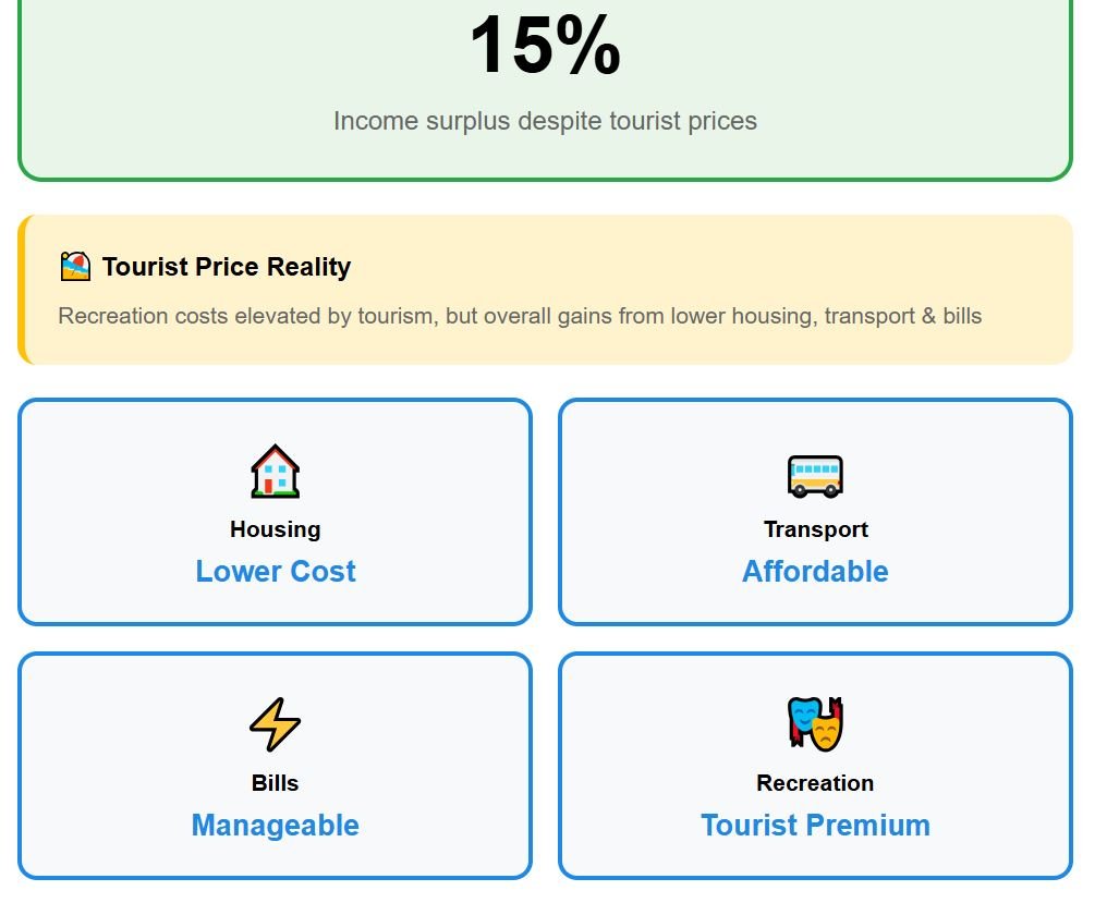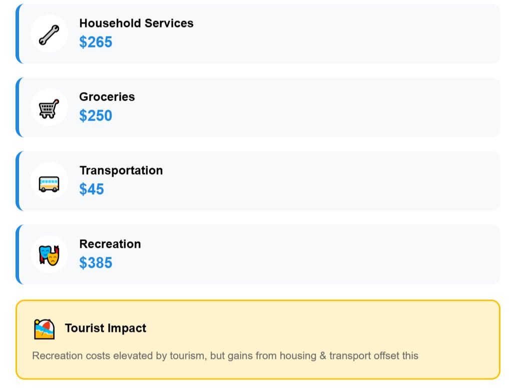 Recreation costs are relatively high compared to everyday expenses—tourists push the price of restaurants higher—yet they do not erase the gains from lower housing, transportation, and bills.