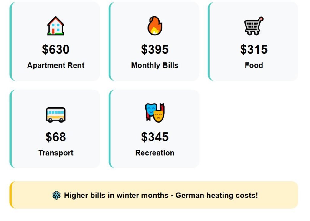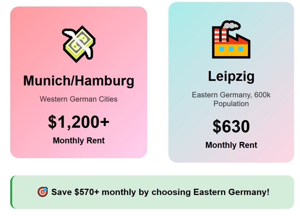 In Germany, the focus is Leipzig, positioned in the eastern part of the country with a population of about 600,000. While Munich or Hamburg are known for high living costs, Leipzig offers a more affordable balance—rent alone shows this difference, at about $630 in Leipzig.