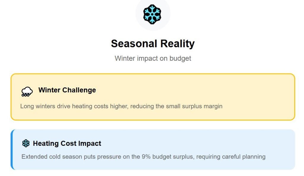 The surplus in Turku is $187 each month, equal to about 9% of income. Even though the numbers show a surplus, the challenge is the seasons—long winters push heating costs higher, and that often eats into the small margin.