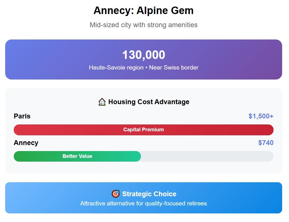 Housing in Annecy averages around $740, monthly bills add about $305, while groceries are near $330. Public transport costs are low at around $80, and recreation adds another $420.