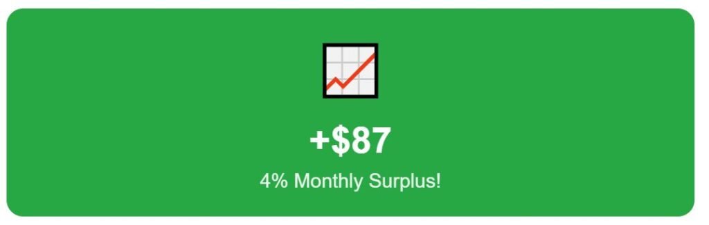 Adding all categories brings total monthly expenses to around $1,753. The remainder from our budget is $254 each month, or 13% of the income.