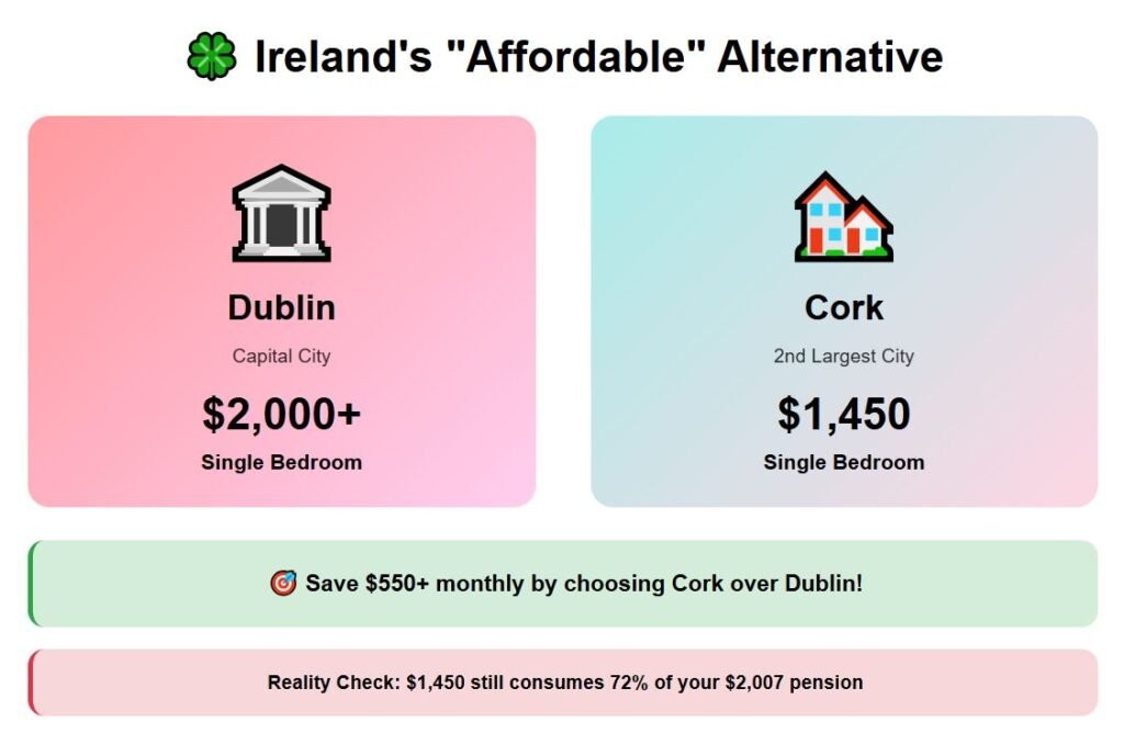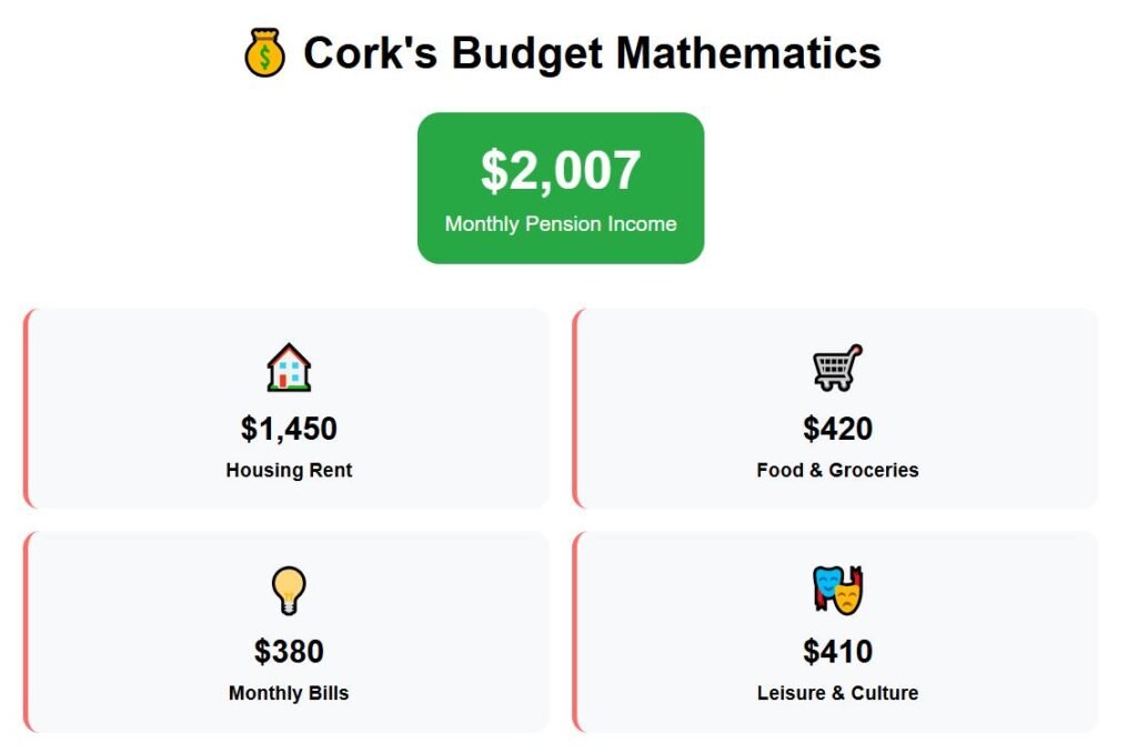 Compared to the capital, living costs are lower, particularly in housing, as Dublin’s rents close to $2,000 for a single-bedroom unit, while Cork provides the same space for about $1,450. Which is still very expensive for our budget—a $2,007 pension barely covers the main expenses in Cork.