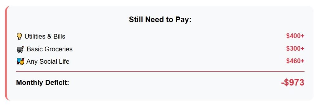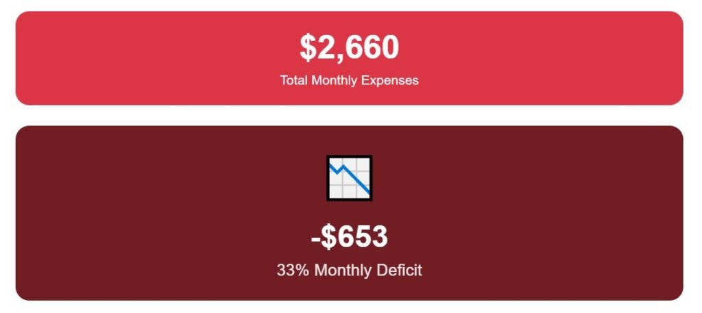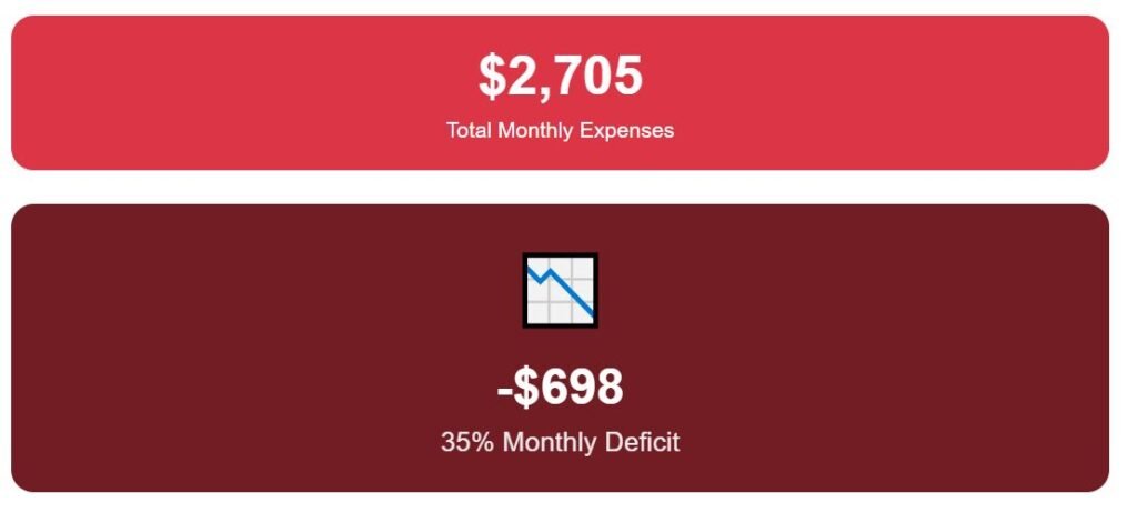 Groceries alone are about $355, utilities add roughly $335, and commuting is another $75. After adding recreation and eating out, all expenses together reach $2,705—a deficit of $698, or 35% of monthly income in the red.