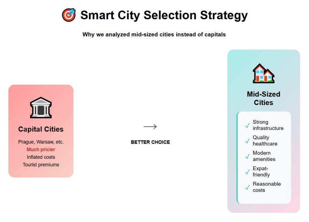 Capitals like Prague or Warsaw are often much pricier than their countries, while medium cities are attractive to expats due to strong infrastructure, healthcare, and amenities—without the inflated bills.