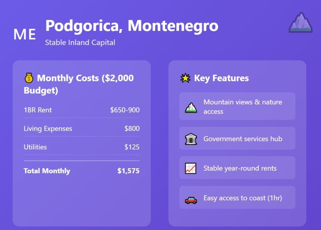 Podgorica, Montenegro, offers balance. Costs are steadier, rents less volatile. Not as cheap as Albania, not as expensive as Croatia.