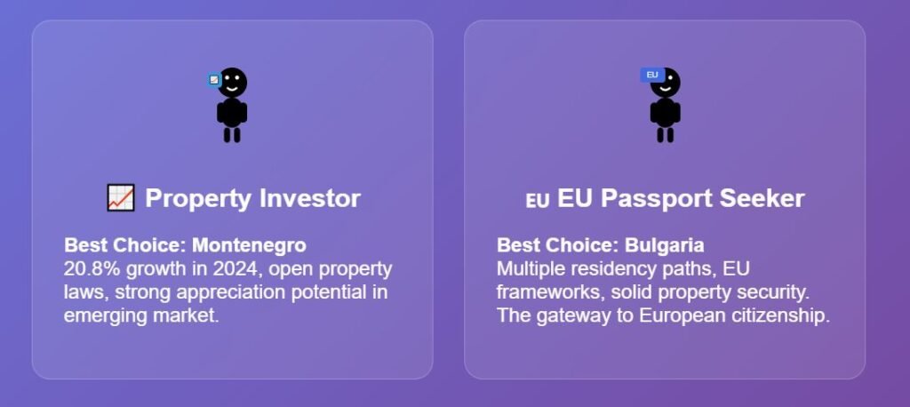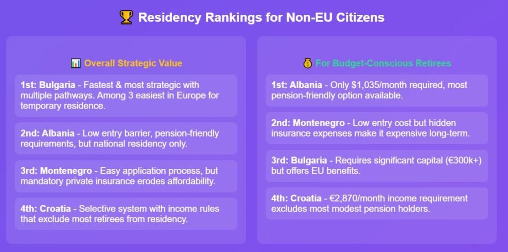 Residency ranking: 1st — Bulgaria — fastest and most strategic residency requirements, with multiple pathways. Bulgaria is among the three easiest countries in Europe to obtain temporary residence, as previously ranked. 2nd — Albania — with a low entry barrier and low requirements. 3rd — Montenegro, and in 4th is Croatia due to their stricter and higher income rules.