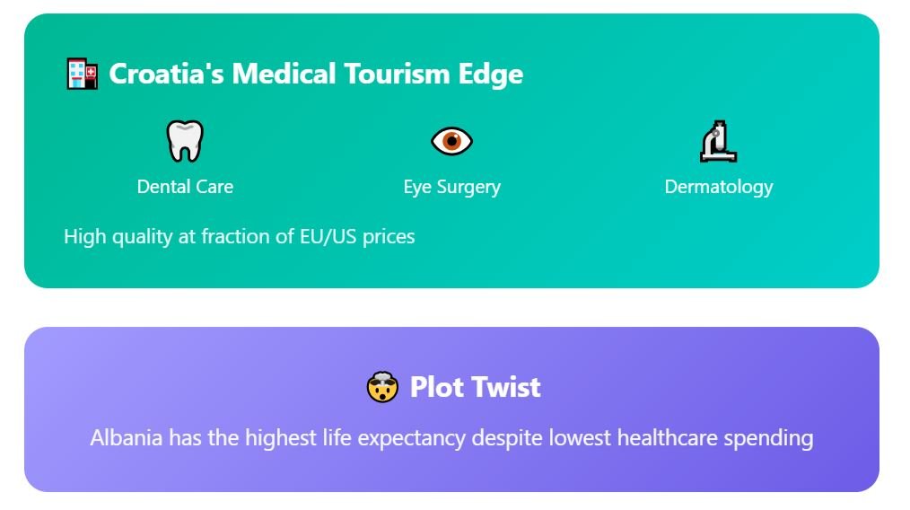 Ranking the healthcare systems: 1st — Croatia — a JCI-accredited hospital and shorter waits. 2nd — Bulgaria — EU stability, reasonable access to private care. 3rd — Albania — high life expectancy overall, but more fragile infrastructure. 4th — Montenegro — residency rules exclude you from public care.