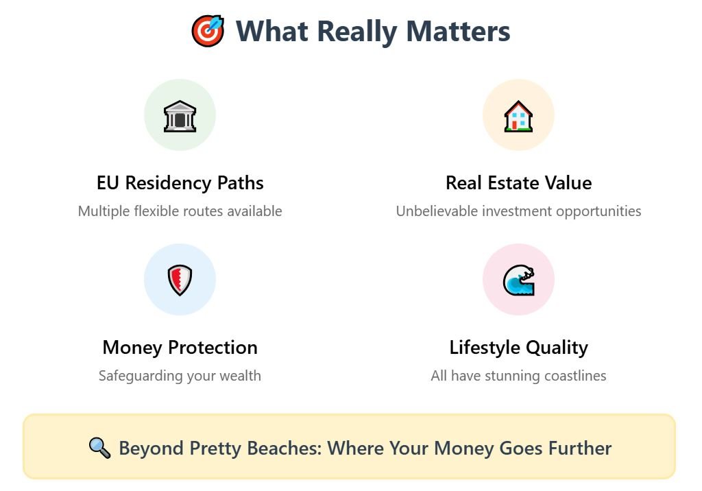 This isn’t about which beach looks prettier — all four have breathtaking coastlines. It’s about where your money and residency actually go further. Different risks, different rules, different rewards.