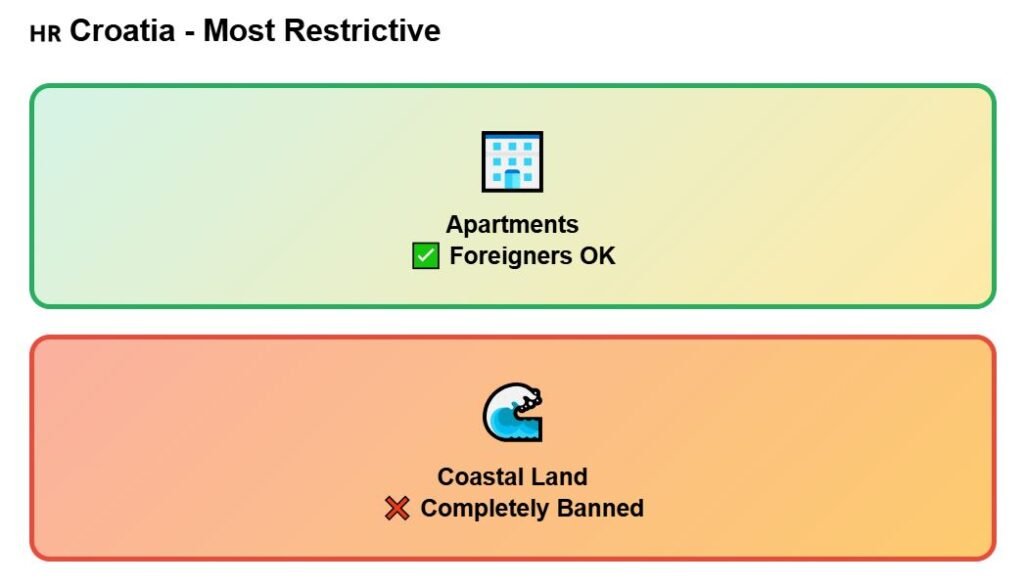Croatia illustrates this clearly. Split has one of the region’s most sought-after markets, known for protecting capital rather than delivering big returns. Apartments can be purchased directly by foreigners, but land is far more restricted. Non-EU citizens need Ministry of Justice approval to buy urban plots and are barred entirely from forest and protected coastal zones.