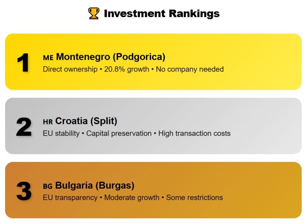Our ranking for property opportunities and regulations is: 1st place — Montenegro: direct ownership rights and rapid growth. 2nd — Croatia: stable EU market. 3rd — Bulgaria, with a good cost-benefit ratio. Albania has the lowest entry prices, but the risks require extra caution.