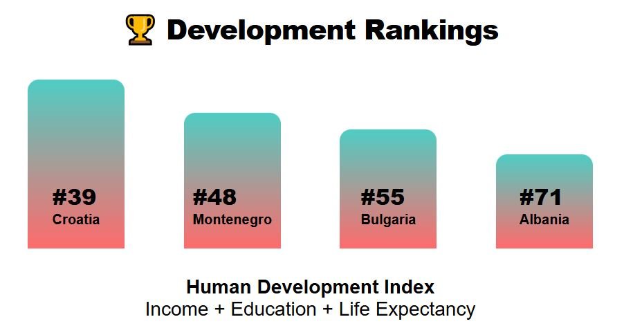 Montenegro holds an HDI rank of 48th, with income per capita around $11,500. Podgorica, its inland capital, is modernizing, but life expectancy is 77.1 years, below both Croatia and Albania.
