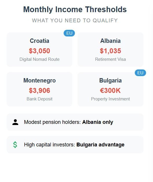 Property-based residency explicitly excludes coverage under the national healthcare system. Permit holders must purchase international private insurance that might cost thousands per year. Montenegro also offers no EU mobility through this residency, leaving expats bound to the country alone. Let’s make a direct comparison. A retiree with a $1,035/month pension qualifies smoothly for Albania but is locked out of Croatia, which gives EU access but sets much higher income hurdles. Montenegro offers quick formal residency, but be aware that you need private insurance.