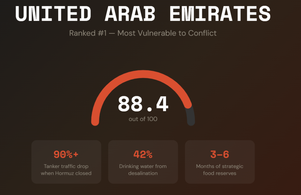 The geopolitical risk score for the UAE is 88.4 out of 100 — the highest on this entire list. Higher than Poland. Higher than the Philippines. The infrastructure is world-class, but it’s completely dependent on supply chains that can be cut instantly.