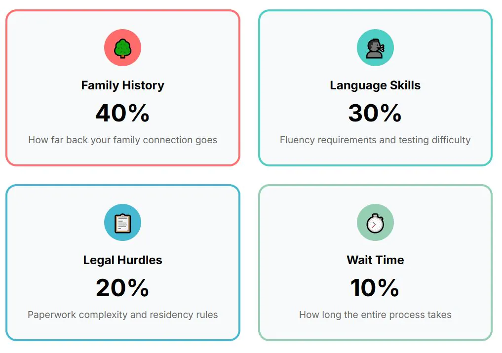 Before we start ranking countries, you need to understand the four factors that determine whether you’ll get citizenship or face rejection. Most people focus on the wrong factors and waste years pursuing impossible cases.