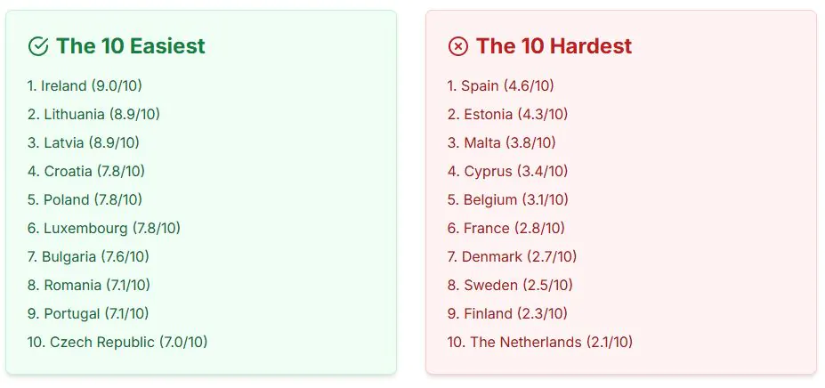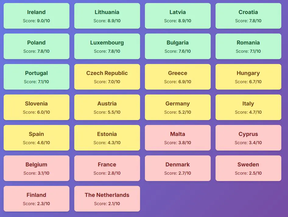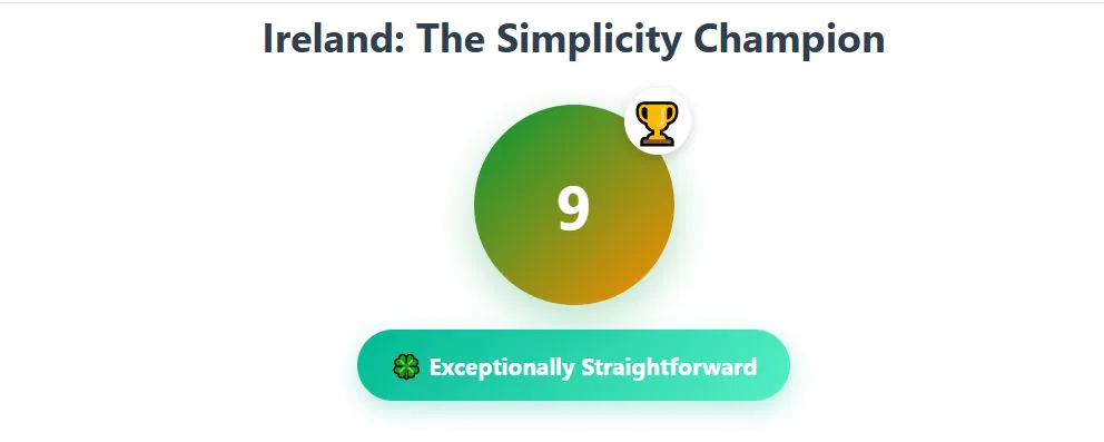 Ireland gets a score of 9 out of 10, securing the top position for accessibility and simplicity. Ireland’s system is exceptionally straightforward.