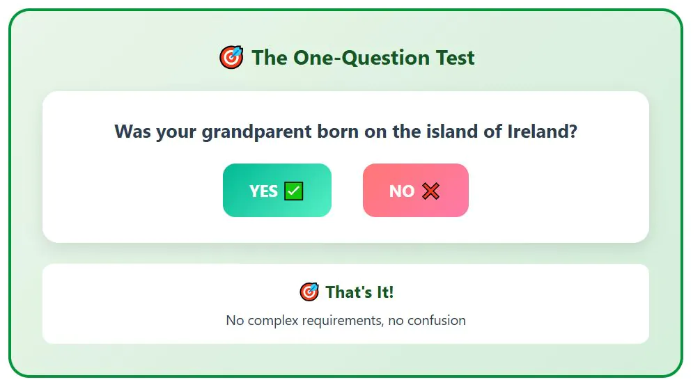 While other countries create complex historical requirements, language barriers, and bureaucratic traps, Ireland focuses on one simple fact: was your grandparent born on the island of Ireland?