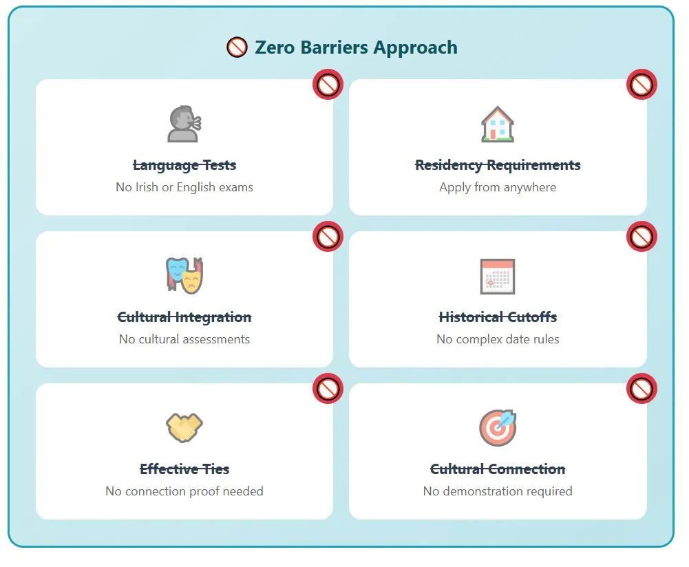 No complex historical cutoff dates, no proof of cultural connection, no demonstration of effective ties to Ireland. Ireland requires no language tests, no residency requirements, and no cultural integration assessments.