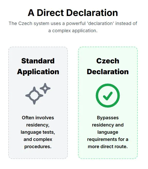This declaration system bypasses standard naturalization requirements like residency periods or language tests. Every foreign document requires certified translation into Czech.