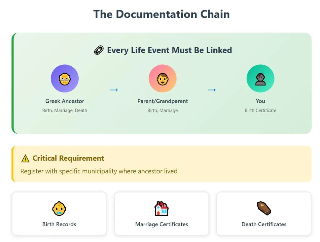 Instead of submitting an application and waiting for approval, you register your existing Greek heritage with Greek municipalities. The registration process requires documenting every life event – births, marriages, deaths – across generations to link you to your Greek ancestor.
