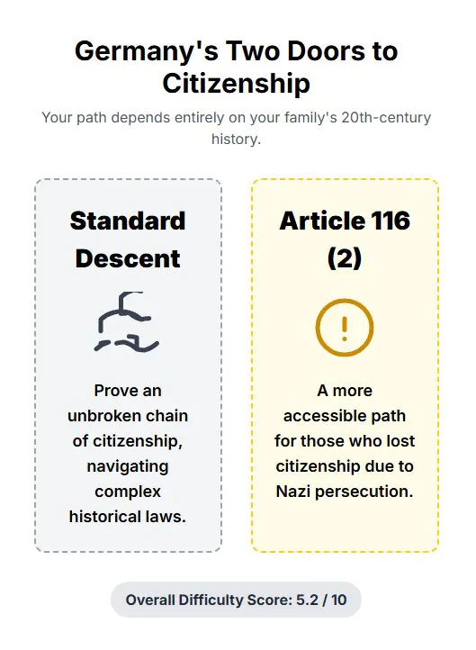 It won’t help your ancestry claim. Your only alternative is naturalization, which requires five years of legal residency, passing a civic integration exam, and, in many cases, renouncing your original citizenship.