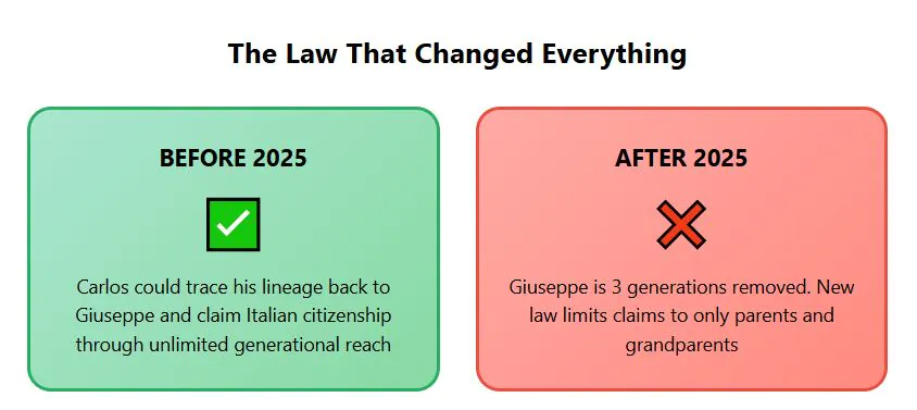 For years, Italy offered unlimited generational reach with no language or residency requirements, making it a favorite among ancestry seekers worldwide. Decree-Law No. 36 changed everything in March 2025. The law limited jus sanguinis to just two generations, meaning only applicants with Italian parents or grandparents can now claim citizenship.
