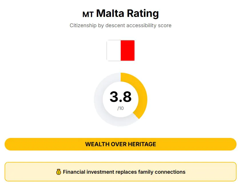 Malta’s score is 3.8 out of 10, and they’ve essentially replaced heritage with wealth as the main pathway. Malta offers citizenship, but it is much easier if you can afford a massive financial investment.