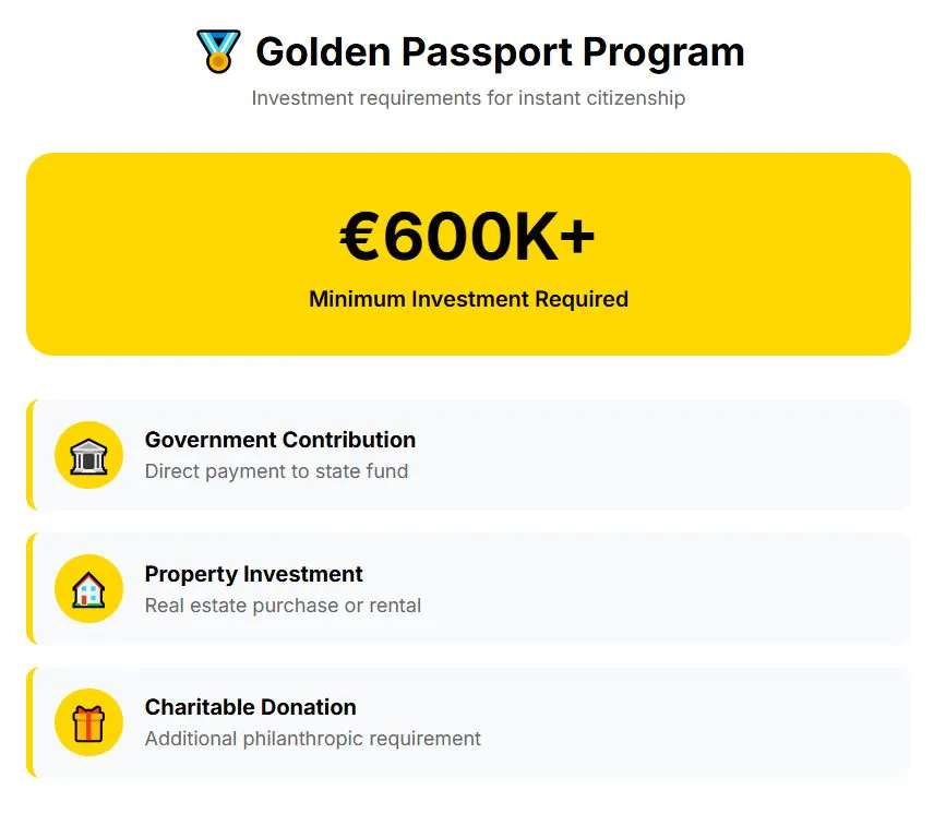 This program requires a financial contribution starting at €600,000, plus additional property investment and donation requirements.