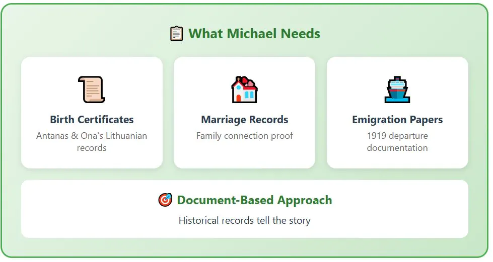 Michael just needs to gather their Lithuanian birth certificates, marriage records, and emigration documentation showing they left Lithuania during the qualifying period – a much easier task than passing some complicated language test.