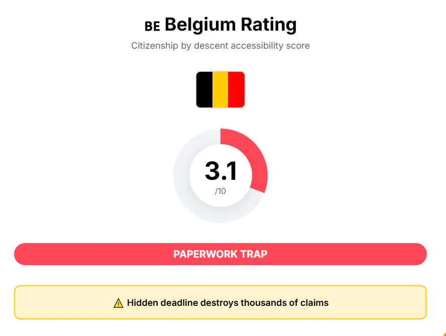 Belgium scores 3.1 out of 10, and there’s a specific document your Belgian parent should have signed before you turned five. If your Belgian parent didn’t file a ‘declaration of attribution’ by your fifth birthday, your claim is dead.