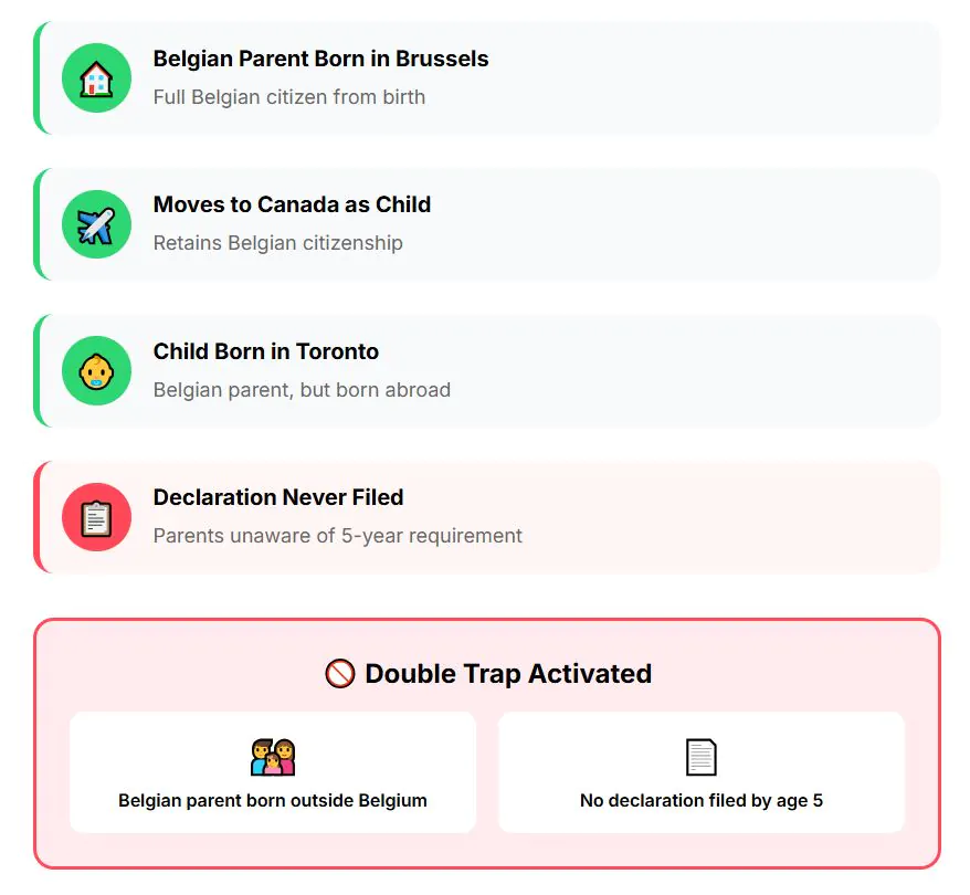 Belgian law requires this declaration when a Belgian parent was also born outside Belgium, making it a double trap for diaspora families. This single paperwork requirement has disqualified thousands of applicants who discovered Belgium’s citizenship laws years too late.