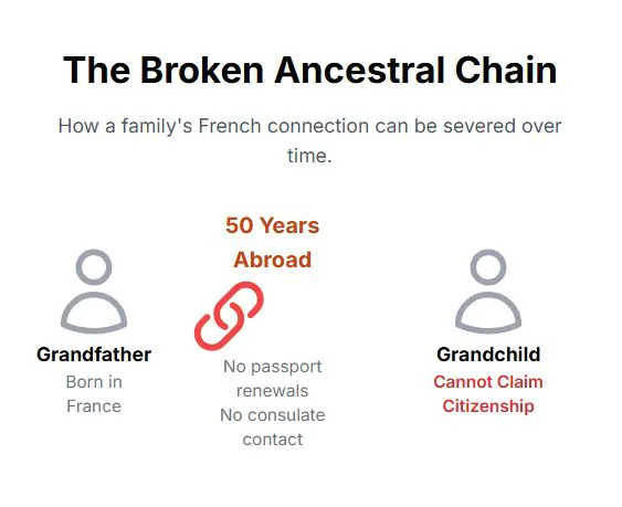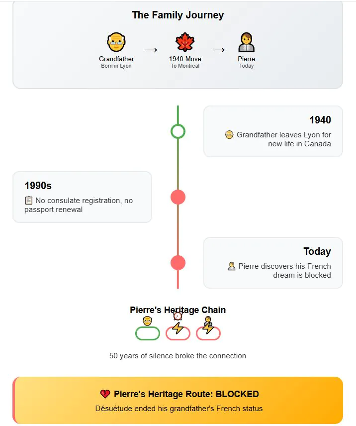 This rule devastates French diaspora communities whose ancestors left France decades ago without maintaining formal ties. Take the case of Pierre Dubois from Montreal.