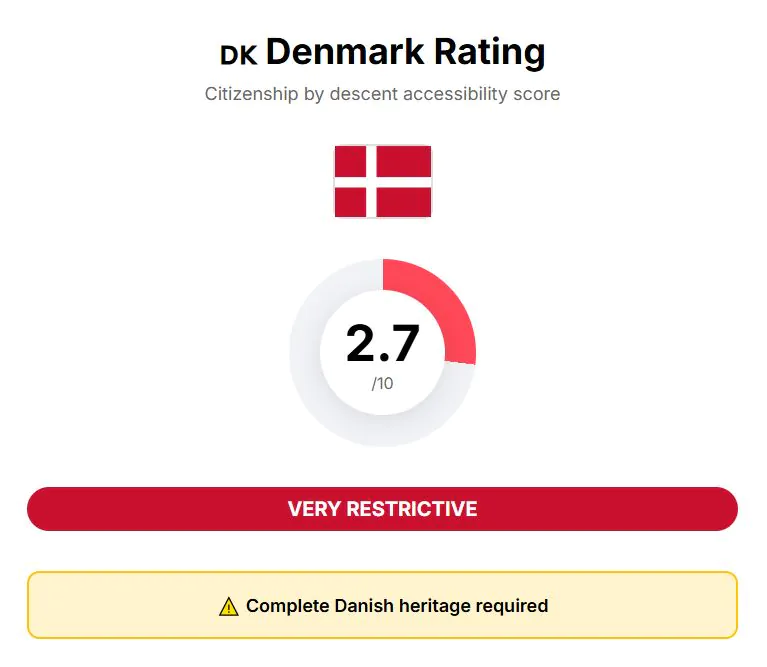 Denmark scores 2.7 out of 10 and has one of the most restrictive ancestry requirements in Europe. Having one Danish grandparent isn’t enough – Denmark wants proof of complete Danish heritage.