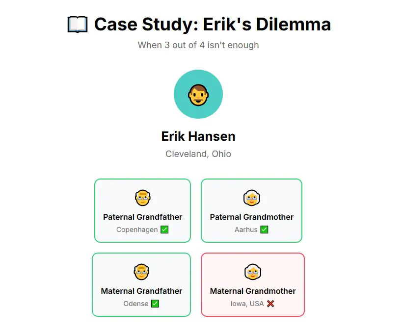 This requirement acts as a similar “Generational Wall” that stops most mixed-heritage families cold. Denmark requires both parents OR all four grandparents to be natural-born Danish citizens.