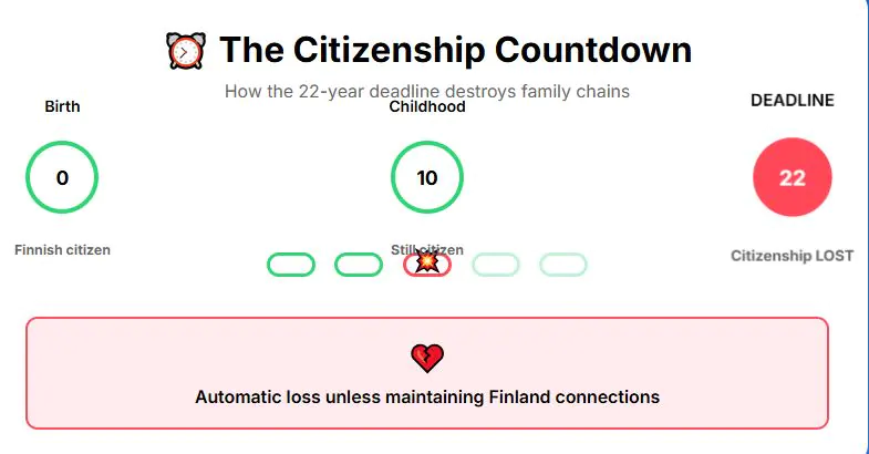 Finland operates under the 22-year rule, which creates an automatic citizenship trap that most families never see coming. Here’s how it works: Finnish citizens born abroad automatically lose their citizenship at age 22 unless they maintain sufficient connections to Finland.