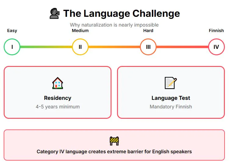 The 4-5 year residency requirement, combined with mandatory Finnish language tests, creates an extremely hard barrier for most applicants.