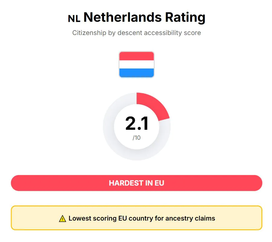The Netherlands scores 2.1 out of 10, making it the hardest EU country for citizenship by descent.